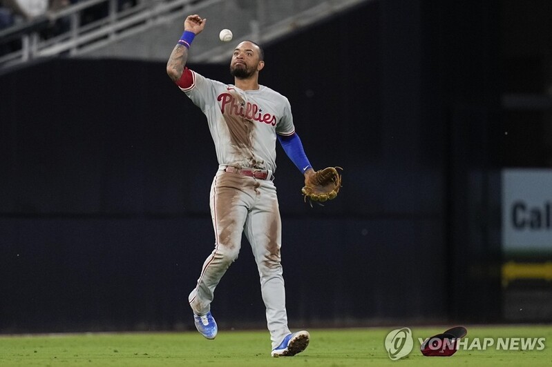 ▲ 김하성의 강습 타구 잡고 세리머니 하는 필라델피아 유격수 이드문두 소사 [AP=연합뉴스]