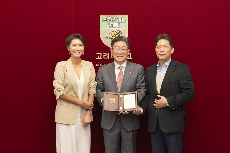 ▲ 한현철·한성주 교우 개교 120주년 기념사업 후원 발전 기금 기부 약정식 왼쪽부터 방송인 한성주 씨, 고려대 김동원 총장, 한현철 씨. [고려대 제공. 재판매 및 DB 금지]