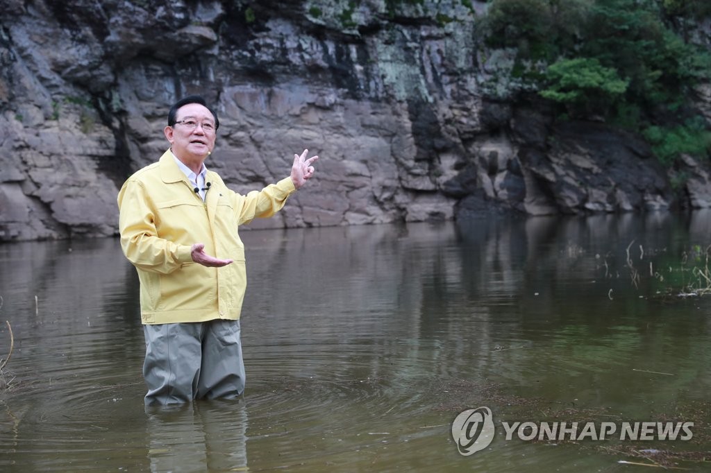 | ▲ 물에 들어가 브리핑하는 송철호 울산시장 지난해 9월 2일 오후 울산시 울주군 언양읍 국보 제285호 반구대 암각화 앞에서 송철호 울산시장이 불어난 하천물에 걸어 들어가 침수된 암각화를 배경으로 브리핑하고 있다. [울산시 제공. 재판매 및 DB 금지] |