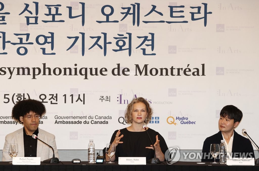 | ▲ 몬트리올 심포니 오케스트라, 공연 앞두고 기자회견 (서울=연합뉴스) 이재희 기자 = 5일 오전 서울 강남구 그랜드인터컨티넨탈서울파르나스호텔에서 열린 '몬트리올 심포니 오케스트라 내한공연 기자회견'에서 바이올리니스트 힐러리 한이 인사말을 하고 있다. 참석자는 왼쪽부터 라파엘 파야레 몬트리올 심포니 음악감독, 힐러리 한, 피아니스트 선우예권. 2022.7.5 scape@yna.co.kr |