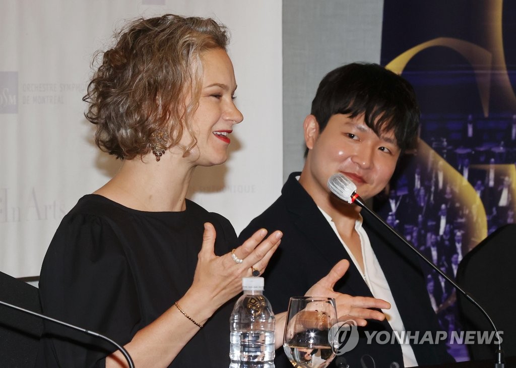 | ▲ 몬트리올 심포니 오케스트라 공연 앞두고 기자회견 (서울=연합뉴스) 이재희 기자 = 5일 오전 서울 강남구 그랜드인터컨티넨탈서울파르나스호텔에서 열린 '몬트리올 심포니 오케스트라 내한공연 기자회견'에 카로 마들렌느 몬트리올 심포니 대표(왼쪽부터), 라파엘 파야레 몬트리올 심포니 음악감독, 바이올리니스트 힐러리 한, 피아니스트 선우예권, 박준식 인아츠프로덕션 이사가 참석하고 있다. 2022.7.5 scape@yna.co.kr |