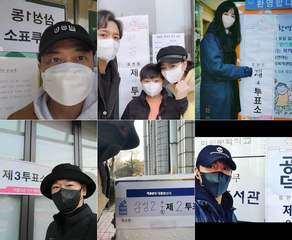 | ▲ 스타들도 소중한 '한 표' 왼쪽 위부터 시계 방향으로 방송인 전현무, 뮤지컬 배우 김소현·손준호 부부, 가수 겸 배우 윤은혜, 가수 김정민, 이승기, 배우 정보석의 투표 인증 사진 [각 인스타그램 캡처. 재판매 및 DB 금지] |