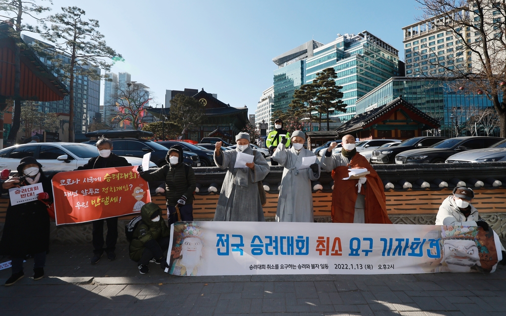 '승려대회 취소를 요구하는 불제자'라는 이름으로 모인 조계종 승려와 신도 20여명은 이날 서울 조계사 앞에서 기자회견을 열어 "이번 승려대회는 국민건강에 위협을 가하고, 선거개입 시비를 일으키고, 일방적 추진으로 승가 분란의 소지가 다분하기에 대부분 스님은 승려대회를 찬성하지 않는다"며 이같이 촉구했다.