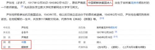 중국 포털 바이두 백과사전도 윤동주 국적을 '중국'으로, 민족을 '조선족'으로 표기하고 있다.