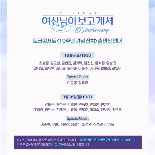 (서울=연합뉴스) 김용래 기자 = ▲ '여신님이 보고계셔' 10주년 기념 토크 콘서트 = 뮤지컬 '여신님이 보고계셔'의 10주년 기념 토크 콘서트가 오는 9일과 16일 서울 대학로 유니플렉스 1관에서 열린다.
