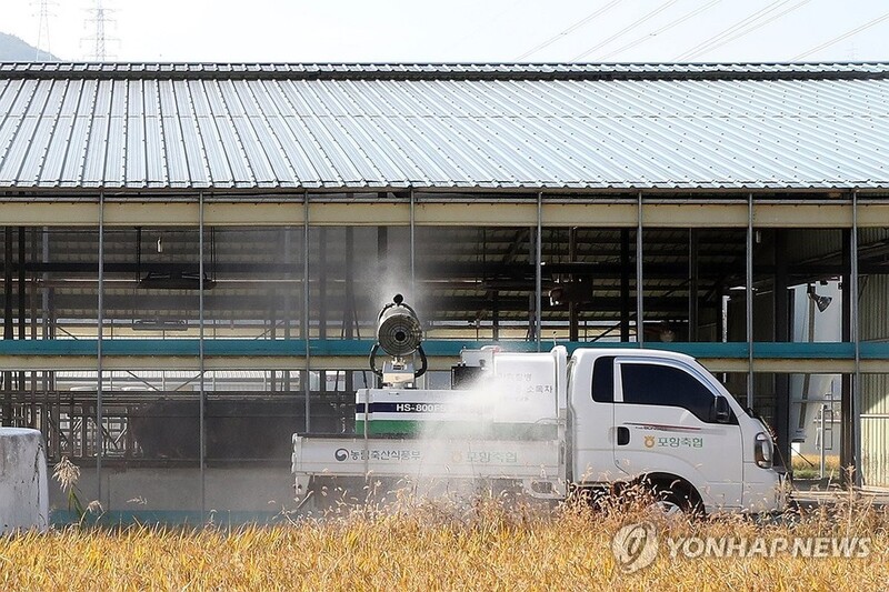 ▲ Officials spray disinfectants at a farm in Pohang, 262 kilometers southeast of Seoul, on October 24, 2023. (Yonhap)