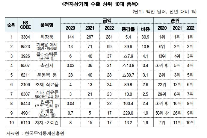 화장품의 작년 전자상거래 수출 금액은 전년 대비 5.4% 증가한 2억8천100만달러로 전체 품목 중 가장 많은 30.9%를 차지했다.