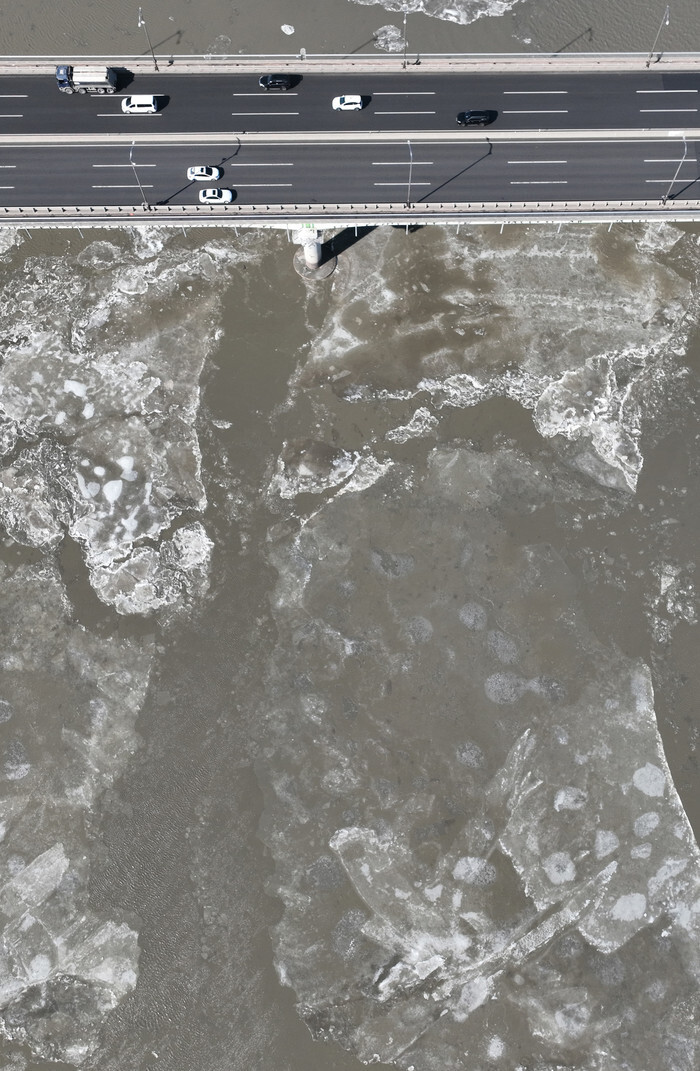 This photo taken Feb. 5, 2025, shows ice floating on the Han River near the Ilsan Bridge in Gimpo, west of Seoul, amid a continued cold wave. (Yonhap)
