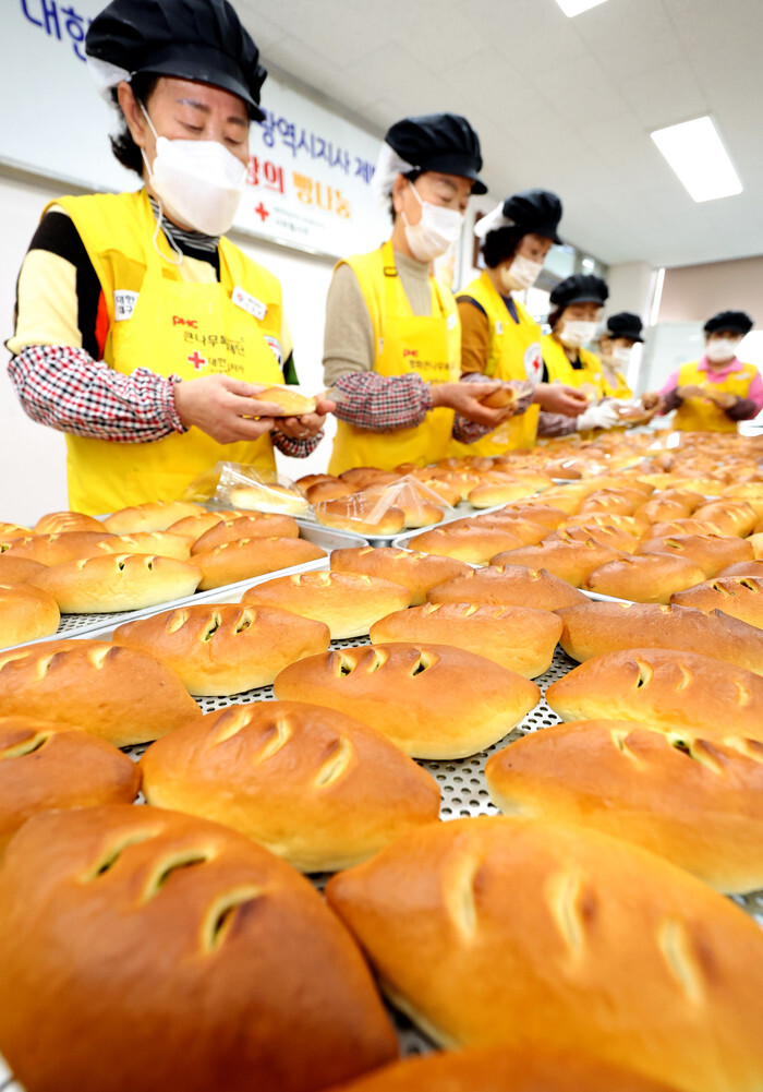Volunteers pack bread at a branch of the National Red Cross in the southeastern city of Daegu on Feb. 5, 2025, to deliver them to impoverished households. (Yonhap)