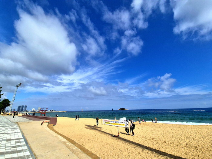 The sky over Sokcho Beach on the east coast is mostly clear with occasional clouds on Oct. 4, 2025, the second day of the weeklong extended Chuseok holiday. (Yonhap)