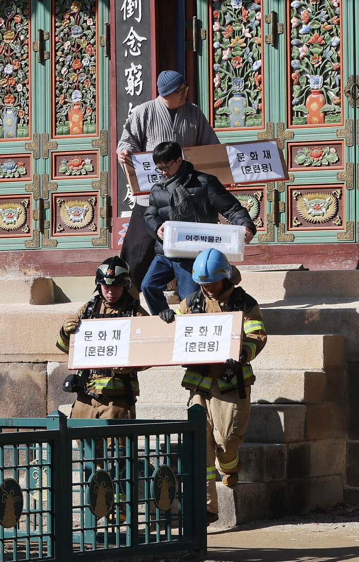 Firefighters and temple workers carry simulated cultural properties out of the main hall of Sinreuk Temple in Yeoju, southeast of Seoul, on Feb. 20, 2025, during a disaster drill on the assumption of a wildfire hitting the area. (Yonhap)