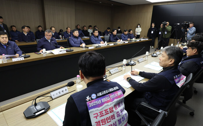 Wage negotiationsSeoul Metro's labor and management hold wage negotiations at the company headquarters in eastern Seoul on Dec. 11, 2025. (Pool photo) (Yonhap)(END)
