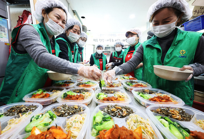Volunteers pack side dishes to be delivered to underprivileged households at a community center in Suwon, south of Seoul, on Dec. 9, 2025. (Yonhap)