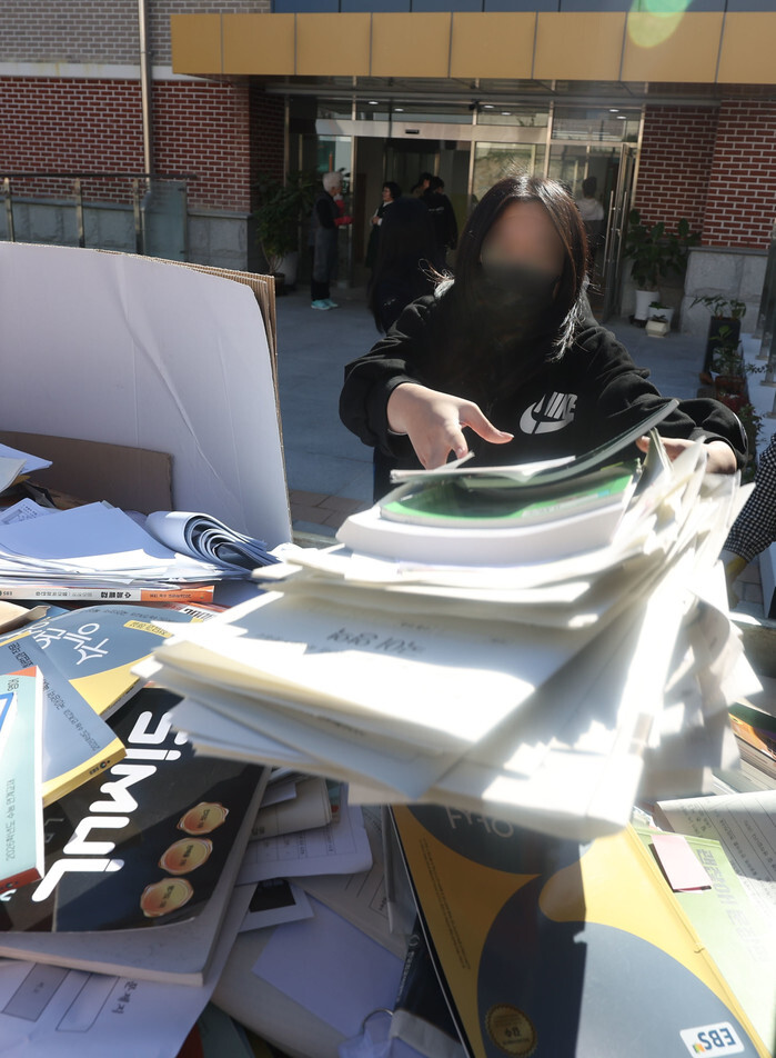 A senior disposes of reference books she used at Sungji Girls High School in the southeastern city of Changwon on Nov. 10, 2025, as part of a celebration marking her completion of preparations for the state-administered scholastic aptitude test, scheduled for Nov. 13. (Yonhap)
