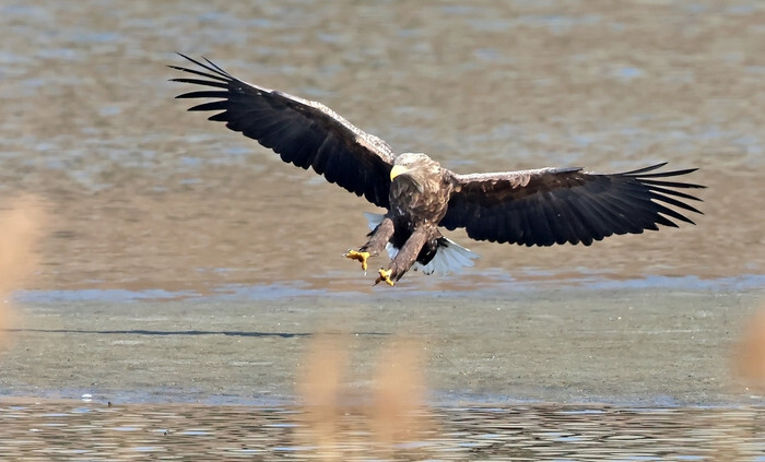 A white-tailed eagle tries to hunt fish with its sharp talons raised on a river in Gangneung, Gangwon Province, on Dec. 8, 2025. (Yonhap)