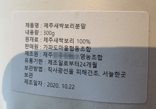 | ▲ 10월 27일자 '가파도 새싹보리' 분말 식품 표시 [연합뉴스 자료사진] |