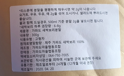 새싹보리 제품의 제조원과 판매원은 '가파도마을협동조합'으로, 원재료 및 함량은 '제주 가파도 새싹보리 100%'로 표기했다.