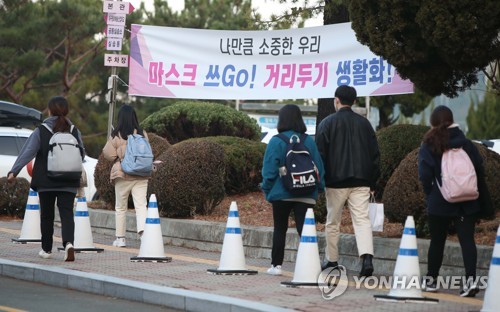 | ▲ '마스크 쓰고 거리두기' (대구=연합뉴스) 김현태 기자 = 21일 중등교사 임용 1차 시험이 치러진 대구 달서구 경북기계공업고등학교 입구에 방역 안내 현수막이 붙어 있다. 2020.11.21 mtkht@yna.co.kr |