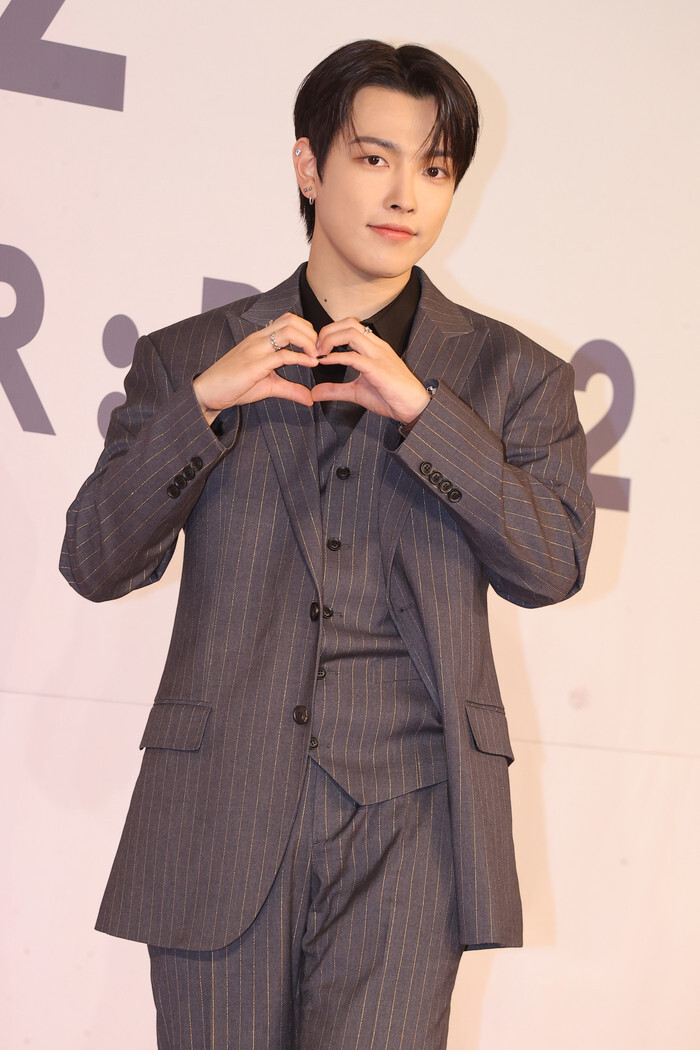 Hongjoong, a member of South Korean boy group Ateez, poses for a photo during a showcase to promote the group's eleventh mini album "Golden Hour: Part 2" in Seoul on Nov. 14, 2024. (Yonhap)