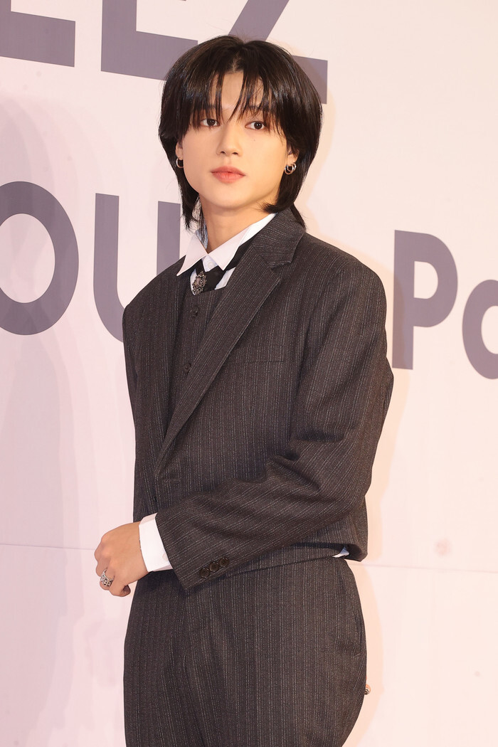 Wooyoung, a member of South Korean boy group Ateez, poses for a photo during a showcase to promote the group's eleventh mini album "Golden Hour: Part 2" in Seoul on Nov. 14, 2024. (Yonhap)