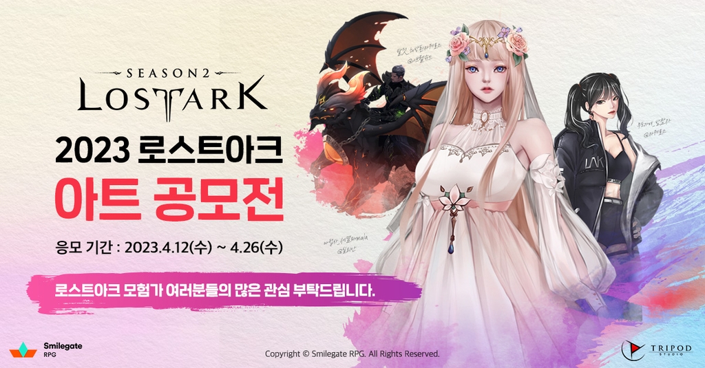 ▲ 스마일게이트RPG는 다중접속역할수행게임(MMORPG) '로스트아크'를 소재로 한 아트 공모전을 개최한다고 22일 밝혔다. 총상금 5천500만원 규모의 이번 공모전은 아바타, 탈것, 펫 디자인 등 11개 분야에서 진행되며, 작품 접수는 다음 달 12일부터 26일까지다. 분야별로 대상 1명, 최우수상 1명, 우수상 3명 등 총 55명에게 상금과 선물을 지급하며, 일부 수상작은 실제 게임 속 아이템으로 구현될 수 있다. (서울=연합뉴스)
