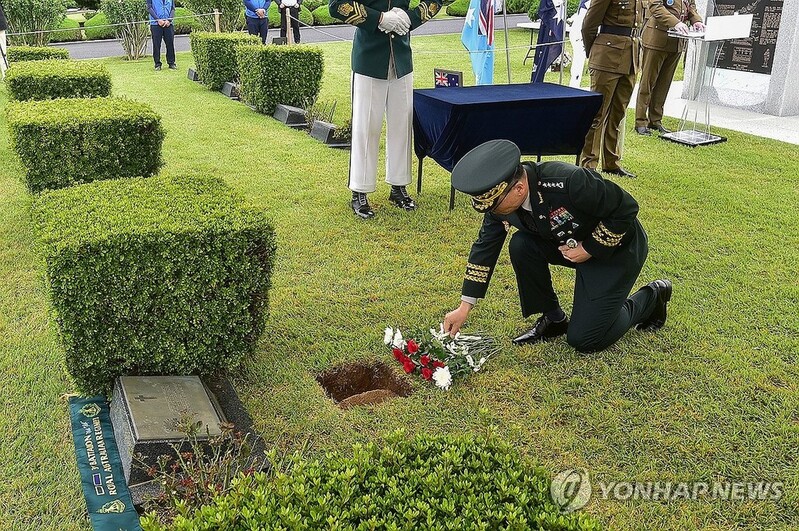 ▲ This photo, provided by the South Korean Army, shows its chief of staff Gen. Park Jeong-hwan, laying flowers at the U.N. Memorial Cemetery in Busan, 320 kilometers southeast of Seoul, on Sept. 21, 2023, during a burial ceremony for Olywn Green, the late widow of Lt. Col. Charles Green, an Australian veteran of the Korean War. (PHOTO NOT FOR SALE) (Yonhap)