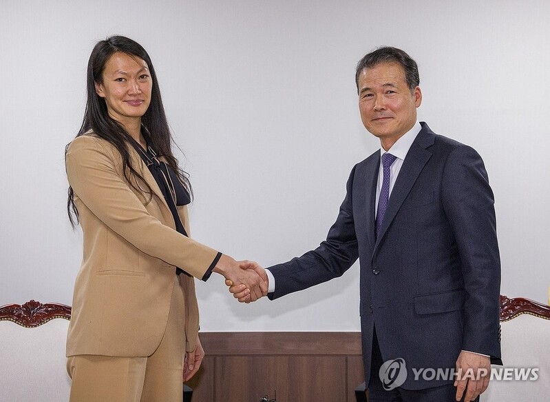 | ▲ Unification Minister Kim Yung-ho (R) and U.S. special envoy for North Korean human rights, Julie Turner, shake hands ahead of their meeting at the ministry on Oct. 17, 2023. (Yonhap) |
