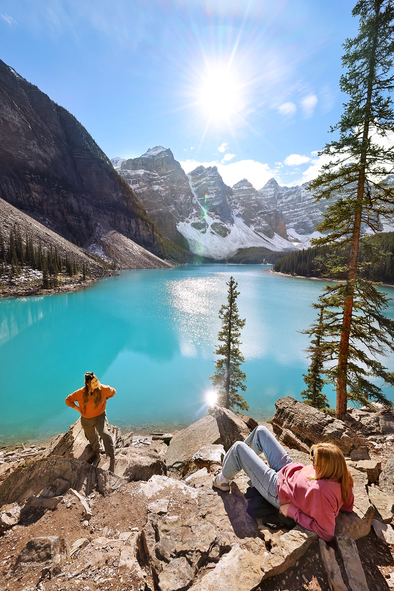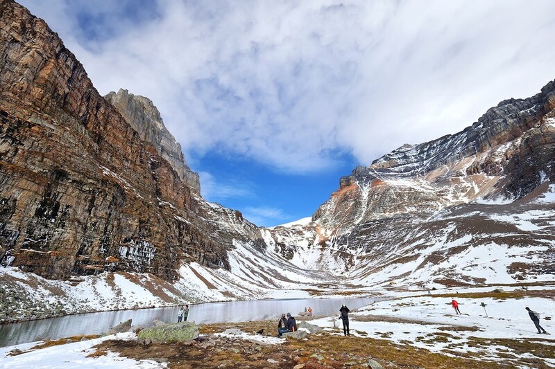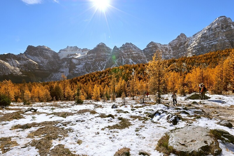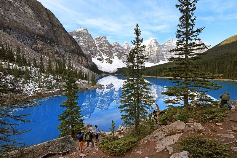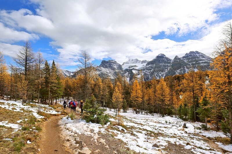 모레인 호수는 눈 덮인 10개의 아름다운 봉우리인 텐픽스와 침엽수림에 둘러싸인 '인생 사진' 명소이다. 청옥빛 호숫물에 비친 텐픽스는 완벽한 데칼코마니를 보여준다. 호수를 뒤로하고 이어지는 등산로는 푸른 침엽수림대와 노랗게 단풍 든 낙엽송 군락을 통과한다. 이어 수목한계선을 지나면 나무는 사라지고 하얀 눈이 펼쳐진 평지가 이어지고 왼쪽에 에펠 피크(해발 3,077m), 오른쪽으로 탬플산(3,543m)이 솟아 있다. 두 봉우리 사이에 캐나다 로키 트레킹 코스 중 가장 높은 고개인 2,611m의 센티널 패스가 있다. 평지 끝에 만나는 미네스티마 호수(2,408m)는 작지 않은데도 거봉과 비교돼 웅덩이처럼 느껴진다. 올라온 길을 돌아보니 아래에 푸른 침엽수, 가운데는 노랗게 변한 낙엽송의 띠, 그 뒤로 병풍처럼 펼쳐진 텐픽스 위로 파란 하늘이 펼쳐져 있다.