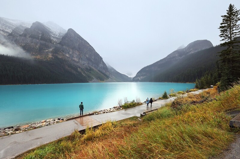 트레킹에 나선 날 비가 내렸다. 주차장을 벗어나 만나는 루이스 호수는 진한 옥빛을 띠고 있다. 멀리 있는 산은 낮게 가라앉은 구름에 가려지고 드러난 앞쪽 두 봉우리가 말귀를 닮았다는 진안 마이산을 연상시킨다. 산행길 초입은 포장돼 있고 숲길로 들어서면 흙길이 펼쳐진다. 키 작은 나무들의 잎이 노랗게 단풍 들어 꽃길을 걷는 기분이다. 숨이 목까지 차오를 무렵 옹달샘같이 아담한 미러호수가 나타난다. 호수 뒤로 빅비하이브가 솟아 있다. 벌집이라는 이름답게 거대한 말벌 집 모양이다. 막바지 계단을 오르니 아그네스 호수와 정상의 티하우스가 나타난다. 아그네스 호수(2,135m) 건너편 산등성이엔 눈이 쌓여 있고 산들의 모습이 수면에 반영되고 있다. 여름에도 서늘해 인기 있는 곳이다. 아그네스 호수를 돌아 올라가면 빅비하이브로 연결된다. 빅비하이브에서 맑은 날이면 레이크 루이스 전경을 내려다볼 수 있다.
