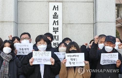 | ▲ Progressive activists hold a news conference in front of the Seoul Western District Court on March 13, 2023, ahead of the court's arrest warrant hearing on a student activist accused of trespassing into a U.S. military base in central Seoul. (Yonhap) |