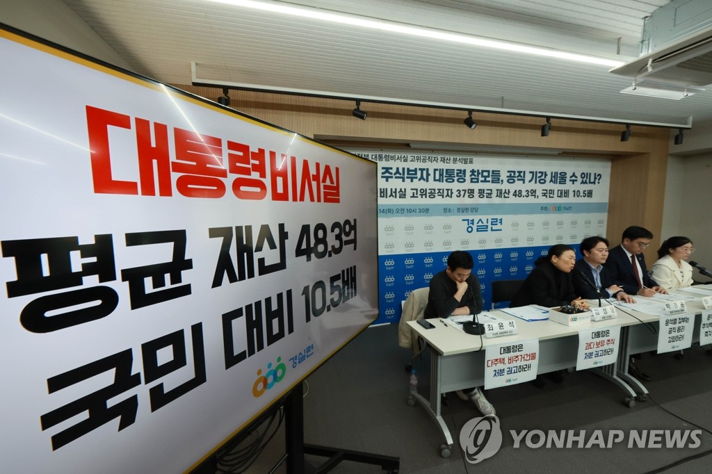 The Citizens' Coalition for Economic Justice disclosed the findings in a press conference after analyzing assets of 37 high-level presidential officials.
