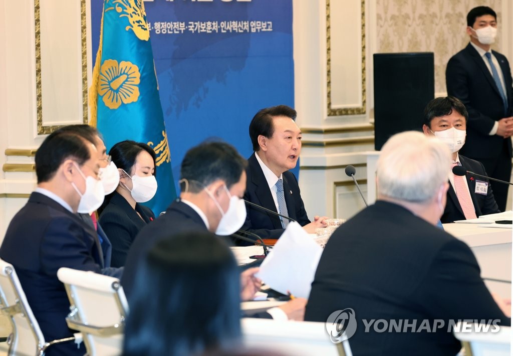 | ▲ President Yoon Suk Yeol (C) speaks at the session of joint policy reports on major tasks for 2023 by South Korea's unification ministry, the interior ministry and other government agencies at the former presidential compound of Cheong Wa Dae on Jan. 27, 2023. (Yonhap) |