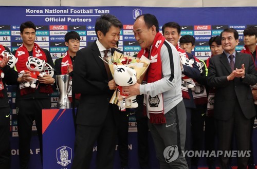 | ▲ In this file photo from Jan. 28, 2020, Korea Football Association President Chung Mong-gyu (L) congratulates Kim Hak-bum, head coach of the men's under-23 national team, at Incheon International Airport, just west of Seoul, after the team won the Asian Football Confederation U-23 Championship in Thailand. (Yonhap) |