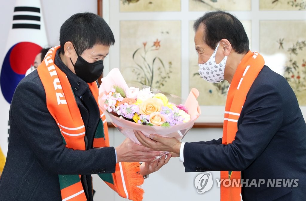 | ▲ 지난해 12월 30일 최문순 지사 환영받는 이영표 강원FC 대표 [연합뉴스 자료사진] |