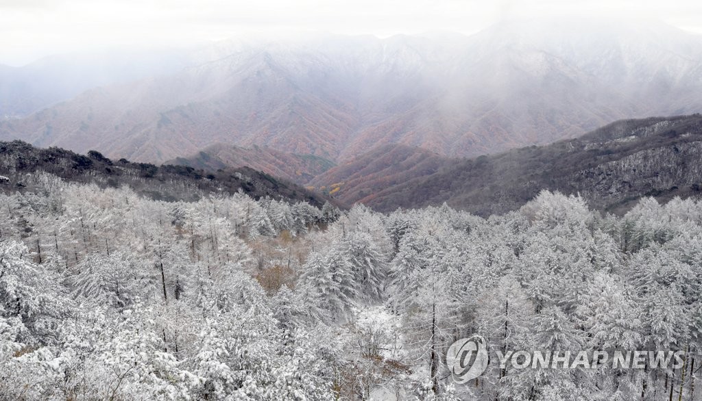 (남원=연합뉴스) 11일 전북 남원의 지리산 정령치에 내린 눈과 상고대가 멀리 산 아래 단풍과 어우러져 한 폭의 수채화를 그려내고 있다.