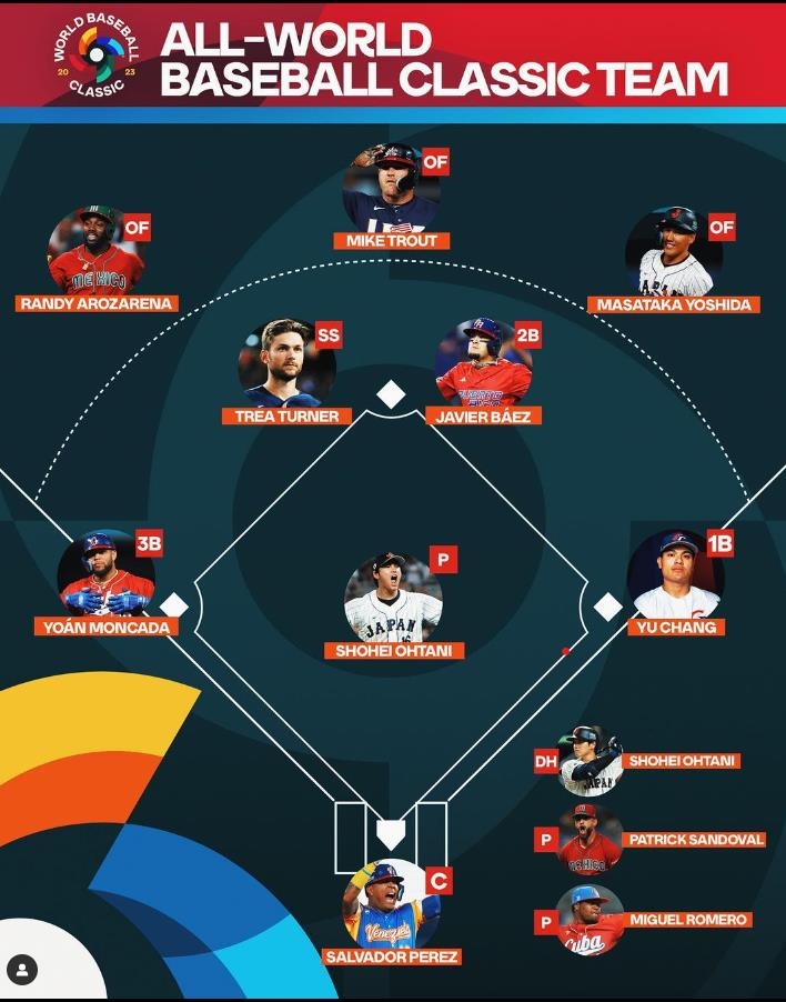 22일(한국시간) 일본의 우승으로 2023 WBC가 막을 내린 뒤 WBC 조직위원회는 사회관계망서비스(SNS) 계정에 포지션별 이번 대회 올스타를 선정해 공개했다.