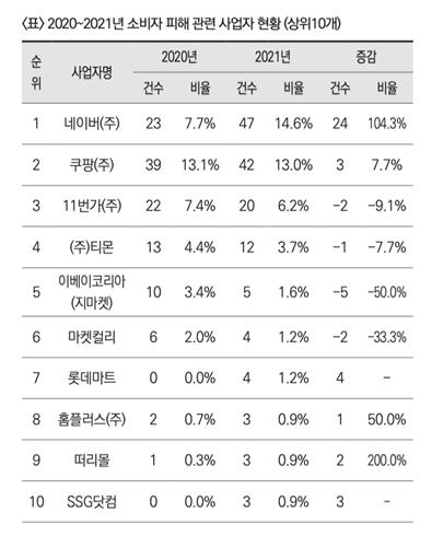 | ▲ 2020∼2021년 소비자 피해 관련 사업자 현황 [한국소비자단체협의회 제공. 재판매 및 DB 금지] |