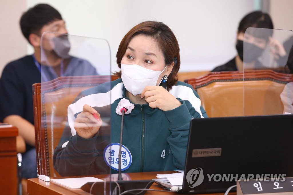 ▲ 오징어게임 옷 입고 질의하는 임오경 의원 (서울=연합뉴스) 하사헌 기자 = 더불어민주당 임오경 의원이 14일 오후 서울 여의도 국회에서 열린 문화체육관광위원회의 한국콘텐츠진흥원, 한국출판문화산업진흥원, 영화진흥위원회 등에 대한 국정감사에서 넷플릭스 '오징어게임' 옷을 입고 조현래 한국콘텐츠진흥원 원장 등에게 OTT 관련 질의를 하고 있다. 2021.10.14 [국회사진기자단] toadboy@yna.co.kr