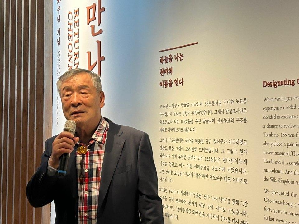 50년 전인 1973년 경주 황남동 155호분 발굴 조사단으로 참여했던 윤근일 전 국립경주문화재연구소장은 아무 말 없이 천마 그림을 바라봤다.