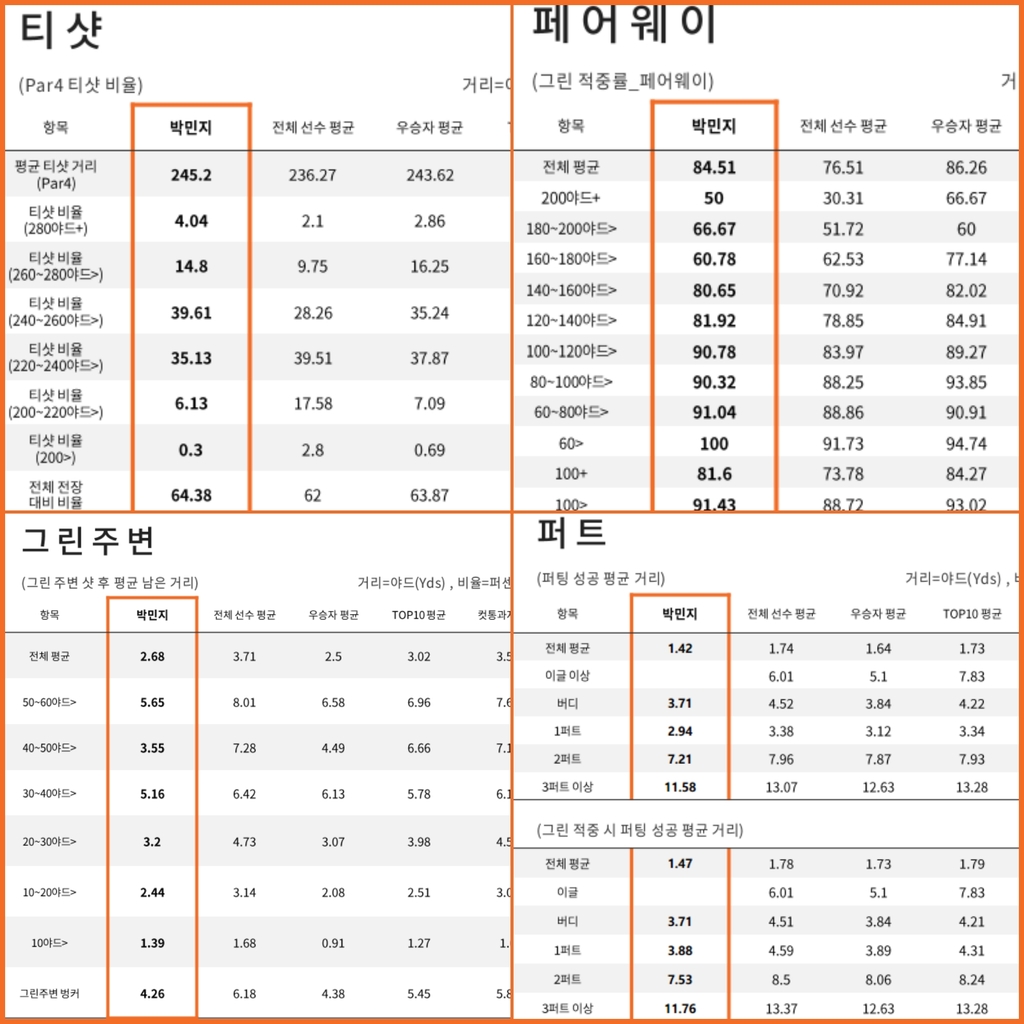 지난 시즌 6승을 올린 박민지(24)는 "느낌으로 알고 있던 것과 수치로 보는 게 다르다"면서 "객관적인 수치를 통해 부족한 점과 잘하는 점을 알 수 있어 좋았다"고 말했다.