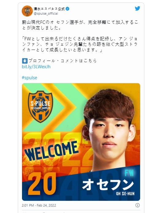 | ▲ 오세훈의 영입을 발표한 시미즈 S-펄스. [시미즈 구단 트위터. 재판매 및 DB 금지] |