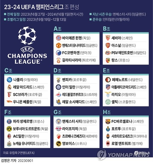 | ▲ [그래픽] 23-24 UEFA 챔피언스리그 조 편성 (서울=연합뉴스) 김영은 기자 = 0eun@yna.co.kr