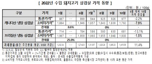 대형마트, 온라인 등 유통채널 수입 삼겹살 소비자가격을 분석한 결과 캐나다산 냉장 삼겹살 100g당 소비자가격은 올해 6월 1천946원에서 10월 1천792원으로 7.9% 하락했다.