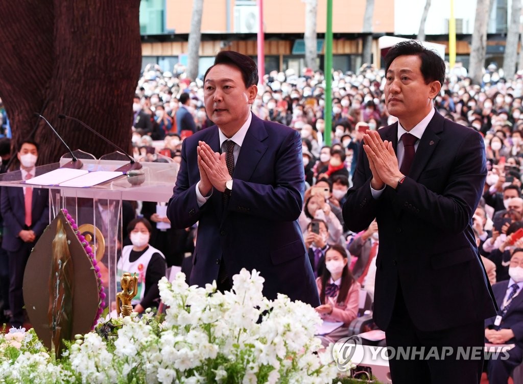 | ▲ 나란히 합장하는 윤석열 당선인과 오세훈 서울시장 (서울=연합뉴스) 윤석열 대통령 당선인과 오세훈 서울시장이 8일 오전 서울 종로구 조계사에서 열린 불기 2566년 부처님오신날 봉축법요식에서 나란히 합장하고 있다. 2022.5.8 [인수위사진기자단] kane@yna.co.kr |