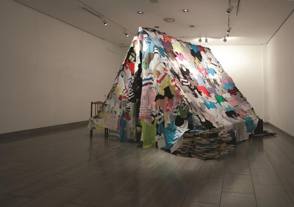 일상적인 사물을 이용해 관계에서 비롯되는 갈등과 불안을 은유하는 작품을 선보여온 정문정의 '요새'는 헌 아동복을 이어 만든 커다란 천으로 은신처를 꾸민 작품이다. 누군가의 몸을 감싸던 옷을 매개로 연대와 돌봄, 회복의 공간을 만들었다.