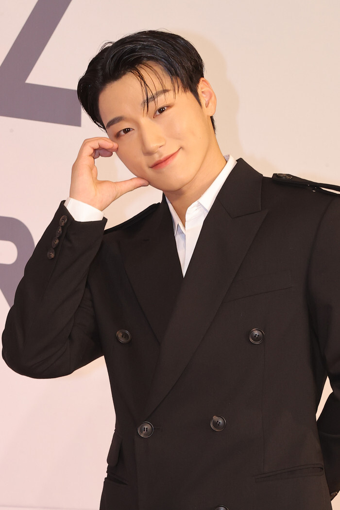 San, a member of South Korean boy group Ateez, poses for a photo during a showcase to promote the group's tenth mini album "Golden Hour: Part 2" in Seoul on Nov. 14, 2024. (Yonhap)