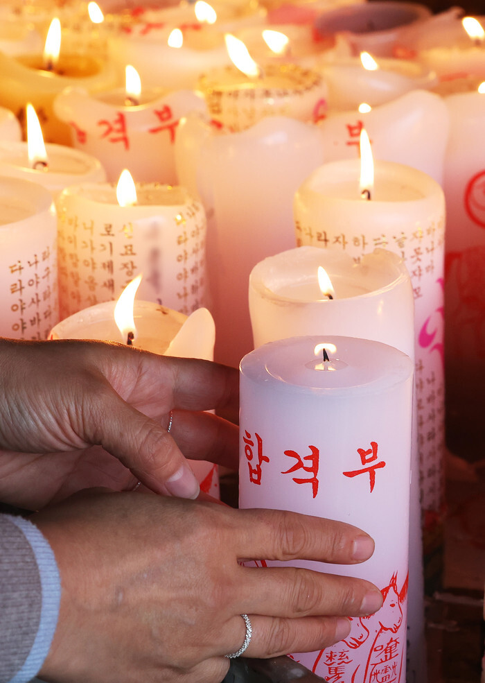 A parent of a college aspirant offers a lit candle to a Buddha statue at Yongju Temple in Hwaseong, south of Seoul, on Oct. 13, 2025, to wish for her child's high scores on the state-administered annual scholastic aptitude test as there are 31 days left until the test. The test, to be administrated across the country on Nov. 13, is a key deciding factor in college entrance. (Yonhap)