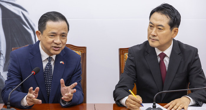 Jang Dong-hyeok (R), chief of the main opposition People Power Party, talks with Chinese Ambassador to South Korea Dai Bing during their meeting at the National Assembly in Seoul on Nov. 21, 2025. (Yonhap)