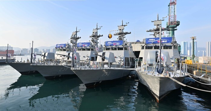 This photo, provided by the Navy, shows the second batch of 230-ton patrol boat killer medium rocket ships docked at a port in the southeastern city of Busan on Dec. 7, 2025. (PHOTO NOT FOR SALE) (Yonhap)