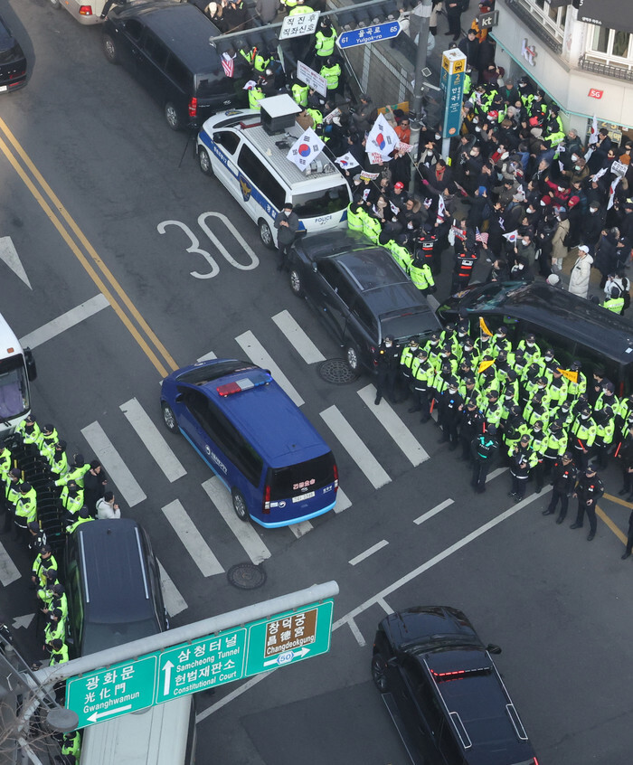 A justice ministry vehicle (C, blue) carrying arrested President Yoon Suk Yeol drives on a road en route to the Constitutional Court in Seoul on Jan. 21, 2025, as Yoon will attend the third hearing of his impeachment trial in connection with his short-lived imposition of martial law in December. (Yonhap)